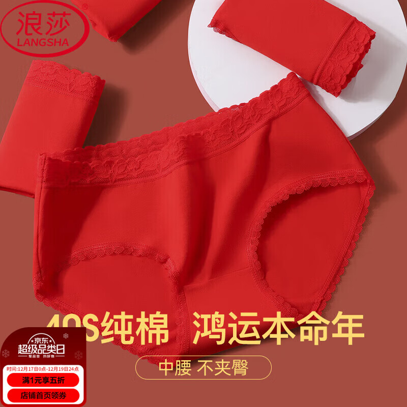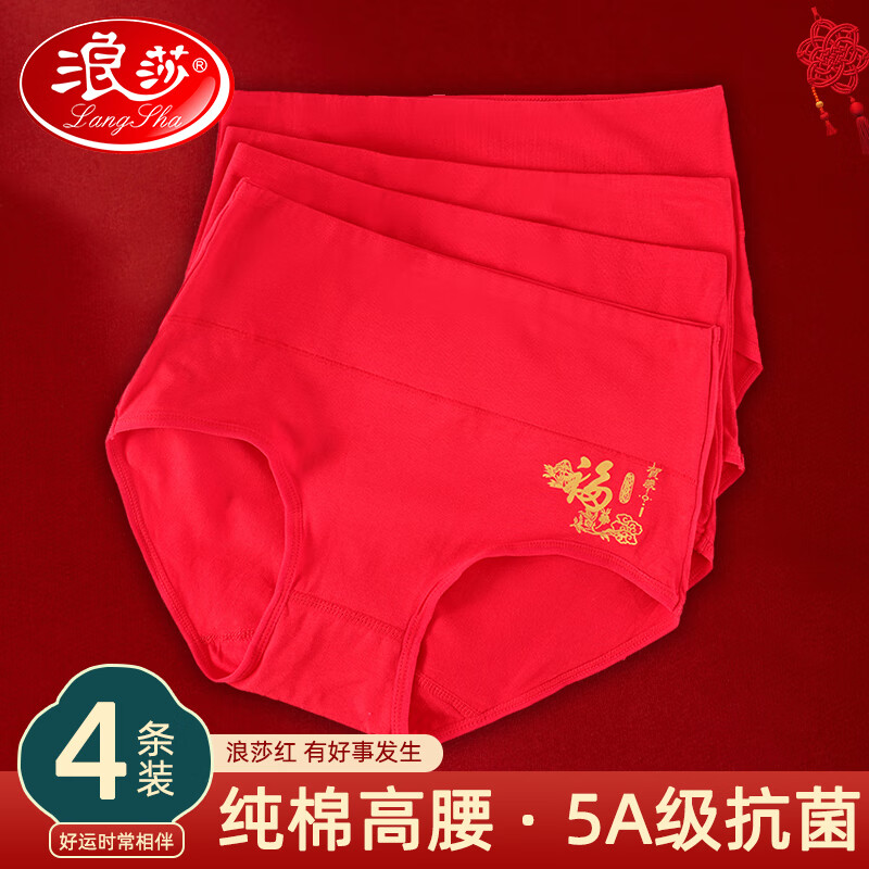 浪莎(LangSha)本命年内裤女纯棉属马年结婚中腰三角裤4条装全棉裆大红女士内裤