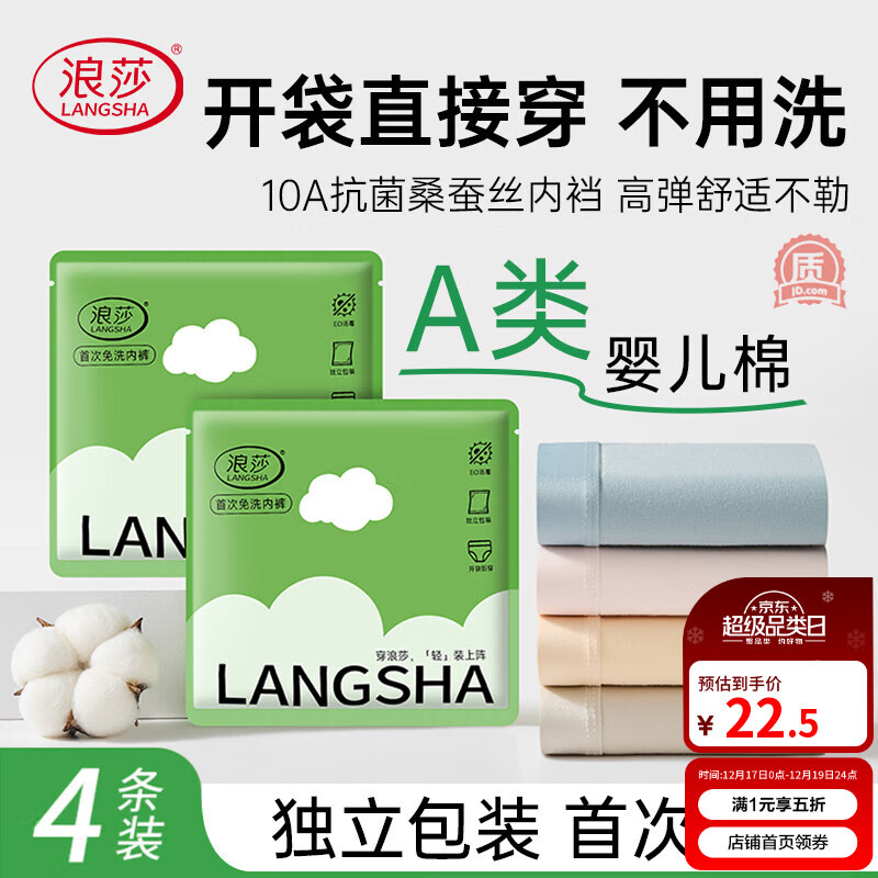 浪莎(LangSha)【首次免洗】女内裤女士全纯棉桑A类棉蚕丝抑菌中腰免洗女三角裤