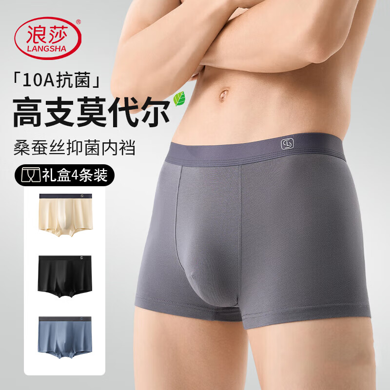 浪莎(LangSha)男士内裤男纯棉莫代尔10A抗菌桑蚕丝底档柔软亲肤透气平角四角短