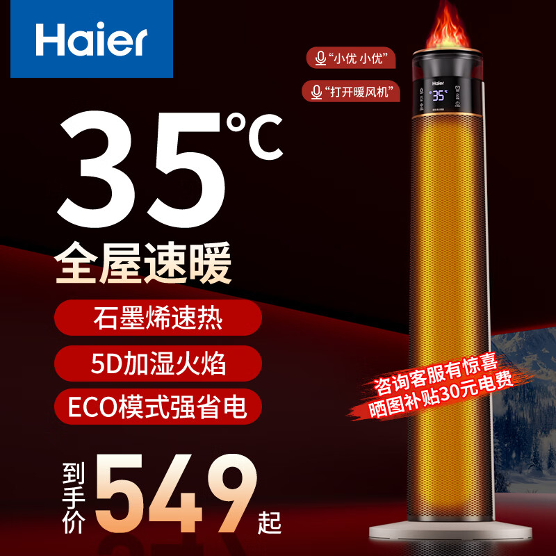 海尔(Haier)石墨烯取暖器家用立式暖风机冬季取暖神器卧室办公室电暖器即开即热电暖气暖风扇热风机婴儿浴室 火焰加湿/等离子净化/语音款HNF-S2261AH