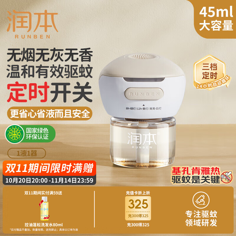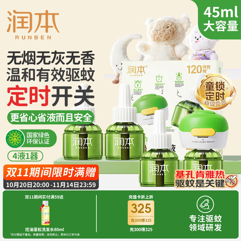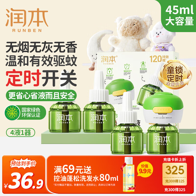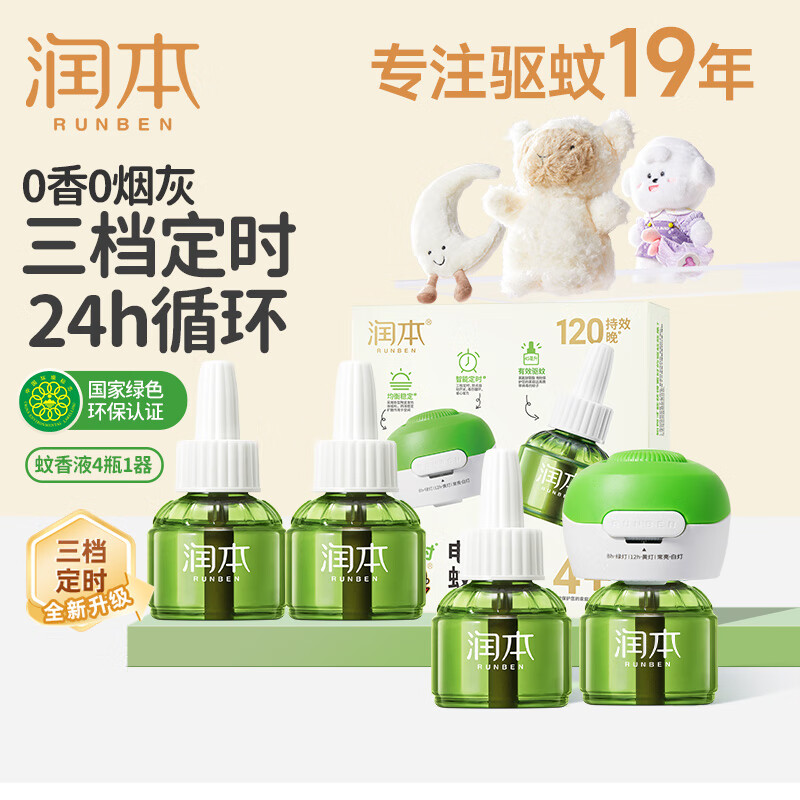 润本(RUNBEN)电热蚊香液无味无灰定时驱蚊器电蚊香防蚊液补充液无香型 45ml 4瓶 3档定时【王牌爆款】1器