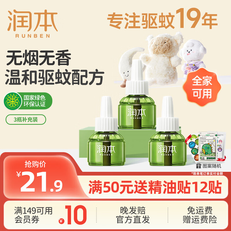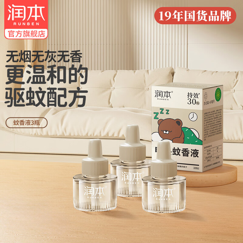 润本(RUNBEN)蚊香液无香定时蚊香器电热蚊香补充液防蚊水家用驱蚊液 3瓶 补充液【续航驱蚊力】无器