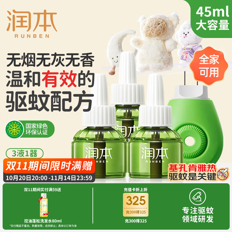 润本(RUNBEN)电热蚊香液无味无灰定时驱蚊器电蚊香防蚊液补充液无香型 3瓶 非定时款【新购优选】1器