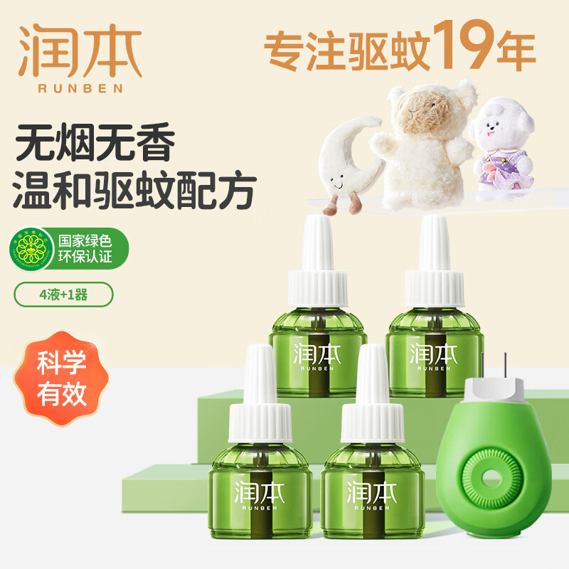 润本(RUNBEN)电热蚊香液无味无灰定时驱蚊器电蚊香防蚊液补充液无香型 4瓶 非定时款【1居室推荐】1器