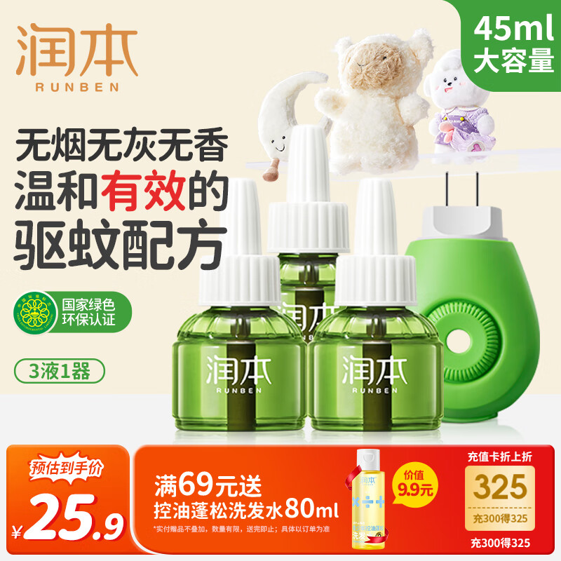 润本(RUNBEN)电蚊香液无味定时智能驱蚊液家用插电式补充液驱蚊水驱蚊器 45ml 3瓶 -无器【可用90晚】