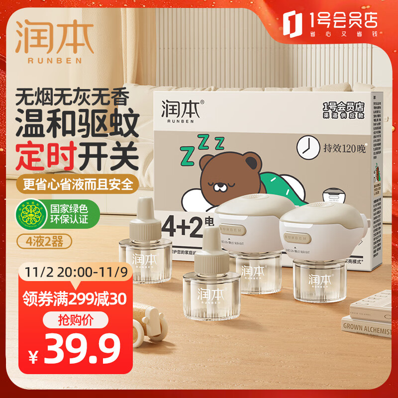 润本(RUNBEN)电蚊香液驱蚊液120晚45ml×4瓶+1器防蚊定时无香型