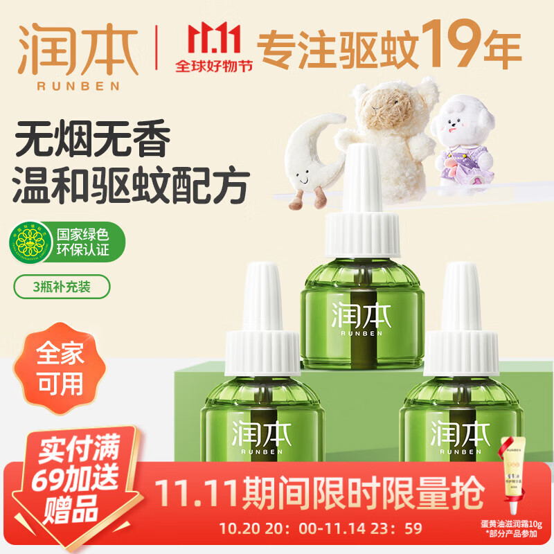 润本(RUNBEN)电热蚊香液无味无灰定时驱蚊器电蚊香防蚊液补充液无香型 3瓶 无器【续航驱蚊】补充装