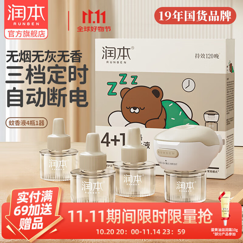 润本(RUNBEN)电蚊香液45ml×4瓶+1器小棕熊三档定时驱蚊液防蚊