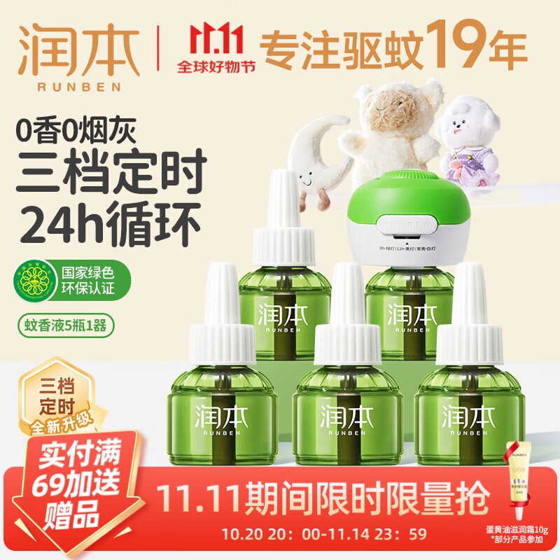 润本(RUNBEN)电热蚊香液无味无灰定时驱蚊器电蚊香防蚊液补充液无香型 45ml 5瓶 3档定时【经典绿瓶】1器