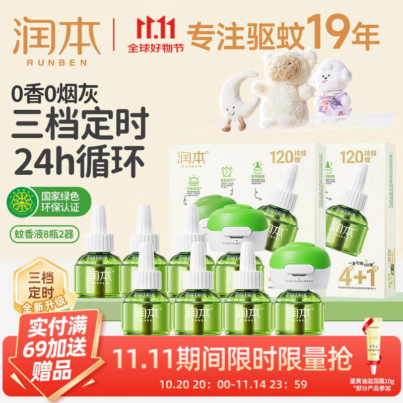 润本(RUNBEN)电热蚊香液无味无灰定时驱蚊器电蚊香防蚊液补充液无香型 45ml 8瓶 3档定时【2居室推荐】2器