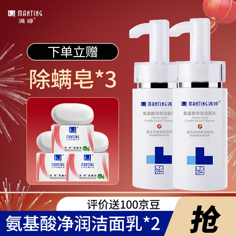 满婷(MANTING) 满婷洗面奶氨基酸洁面乳男女通用面部清洁保湿洁面氨基酸除螨皂 氨基酸洗面奶100g*2+赠清螨皂*3