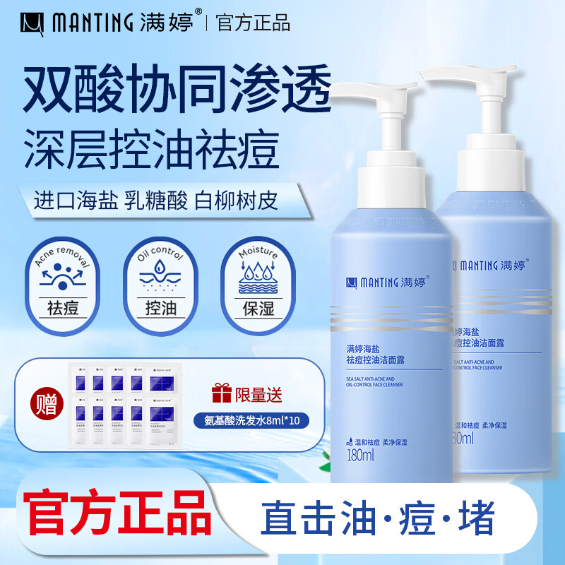满婷(MANTING)海盐祛痘控油洁面露180ml*2(水油平衡改善痘肌保湿男女洗面奶)