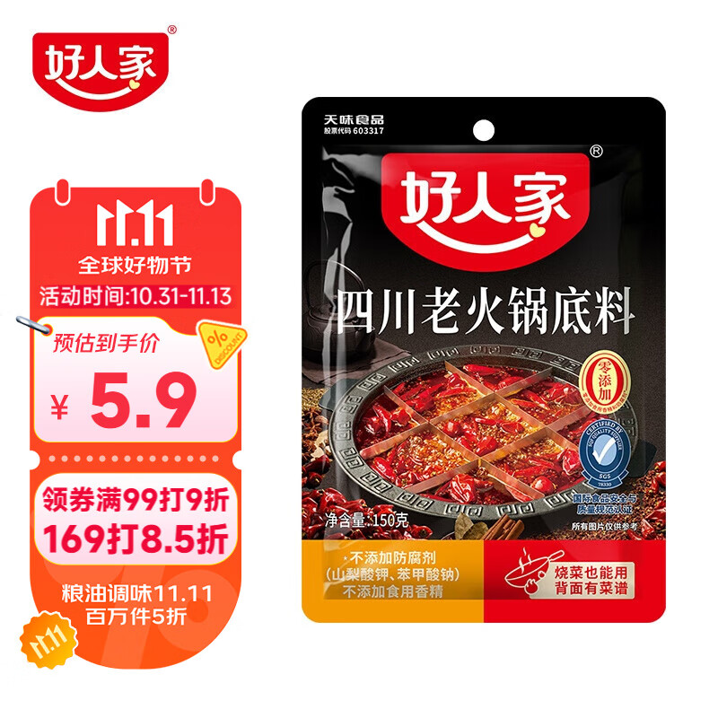 好人家0添加小块装火锅底料 四川老火锅150g*5