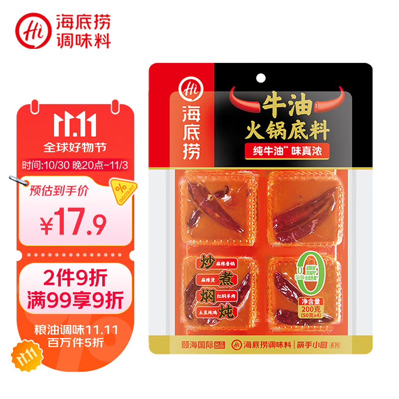 海底捞火锅底料0添加牛油火锅底料 200g(50g*4)含50%食用牛油 手工牛油