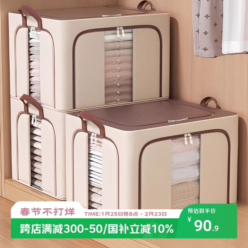 沃尊衣服收纳箱牛津布百纳箱家用衣柜整理羽绒衣物折叠储物盒被子专用 咖啡色【三面开窗】牛津布 88L【60*42*35cm】加粗钢架