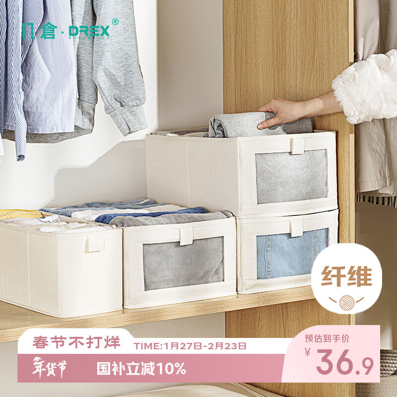 洁百纳衣服收纳箱家用大容量衣柜装衣物牛津布整理盒神器布艺可折叠储物 米白色【单视窗】加厚牛津布 72#【加厚面料 | 结实耐用】