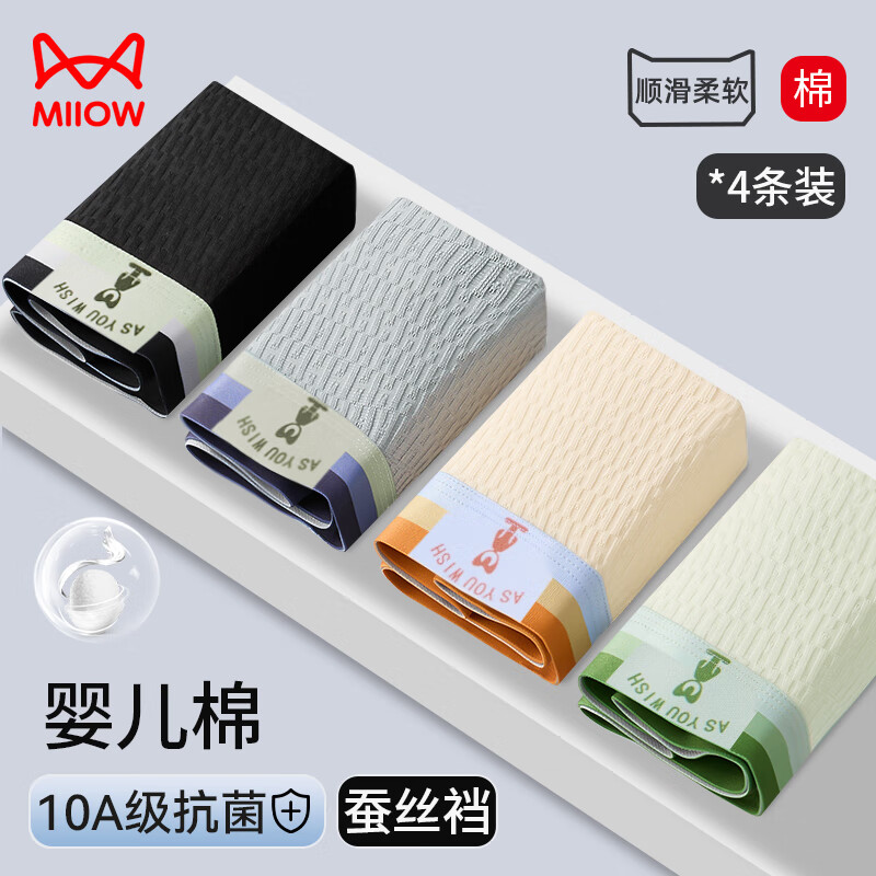 猫人25年新品男士内裤男纯棉平角裤含桑蚕丝内裆10A抑菌男生短裤4条装