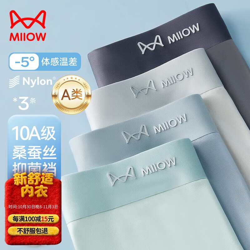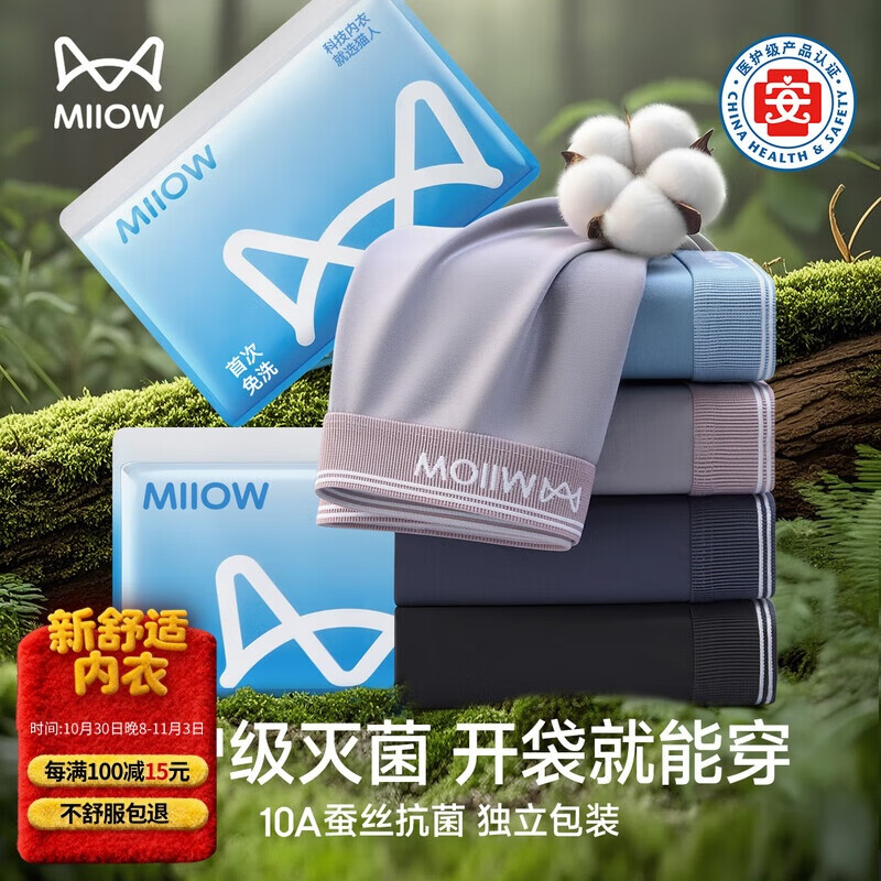 猫人【首次免洗】男士内裤男纯棉10A抗菌含桑蚕丝平角男式内裤医护级