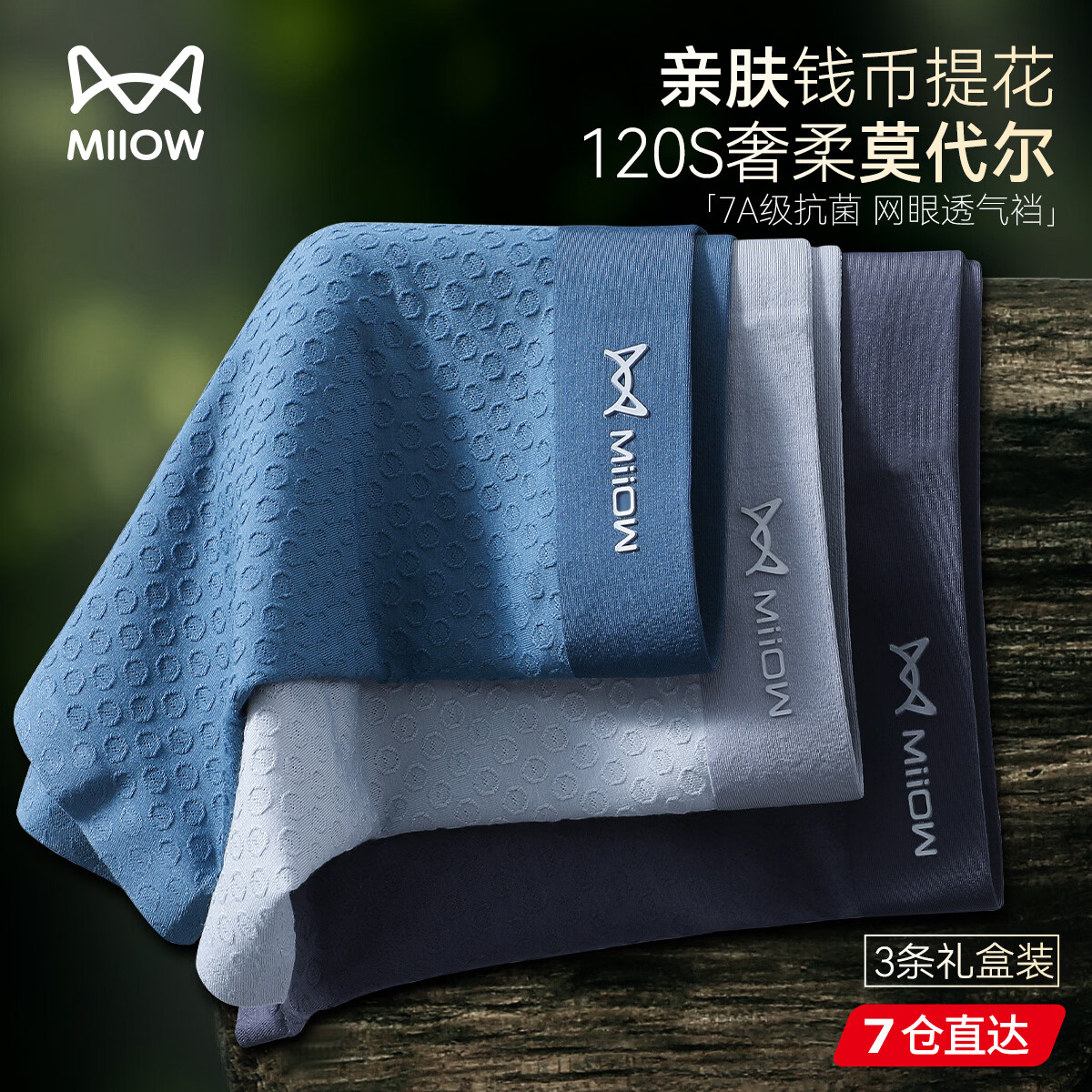 猫人(MiiOW)男士内裤男120S莫代尔无痕7A抗菌平角钱币提花精品高端四角短裤头 (莫代尔)孔雀蓝+珊瑚灰+铁灰 3条 2XL (推荐130-150斤)