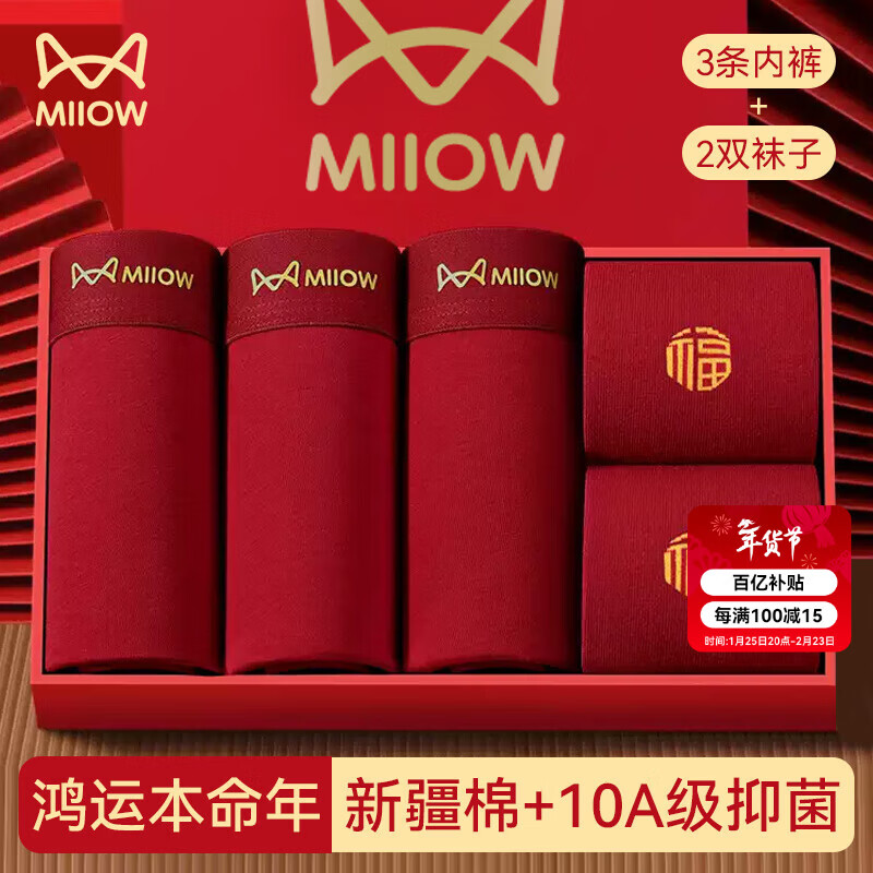 猫人红内裤男本命年马年鸿运纯棉短裤男红袜子组合装袜子2双+内裤3条