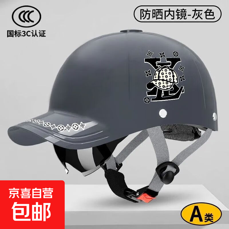 时尚鸭舌帽夏季头盔3C认证摩托电动车头盔四季通用安全帽新国标高档半盔新款 3C认证-灰色V花【内置墨镜】