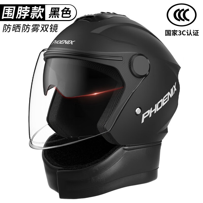 凤凰(Phoenix)新国标A类3C认证电动车摩托车头盔双镜片防雾哑黑围脖男女四季通用电瓶车3/4半盔冬季保暖安全帽