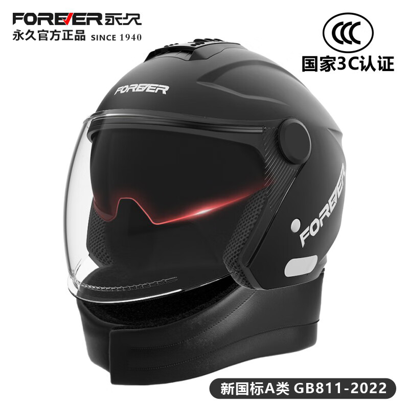永久新国标3C认证电动车头盔防雾防风保暖秋冬季男女士电瓶车3/4盔安全帽 502双镜可拆围脖【亚黑】