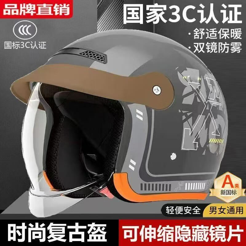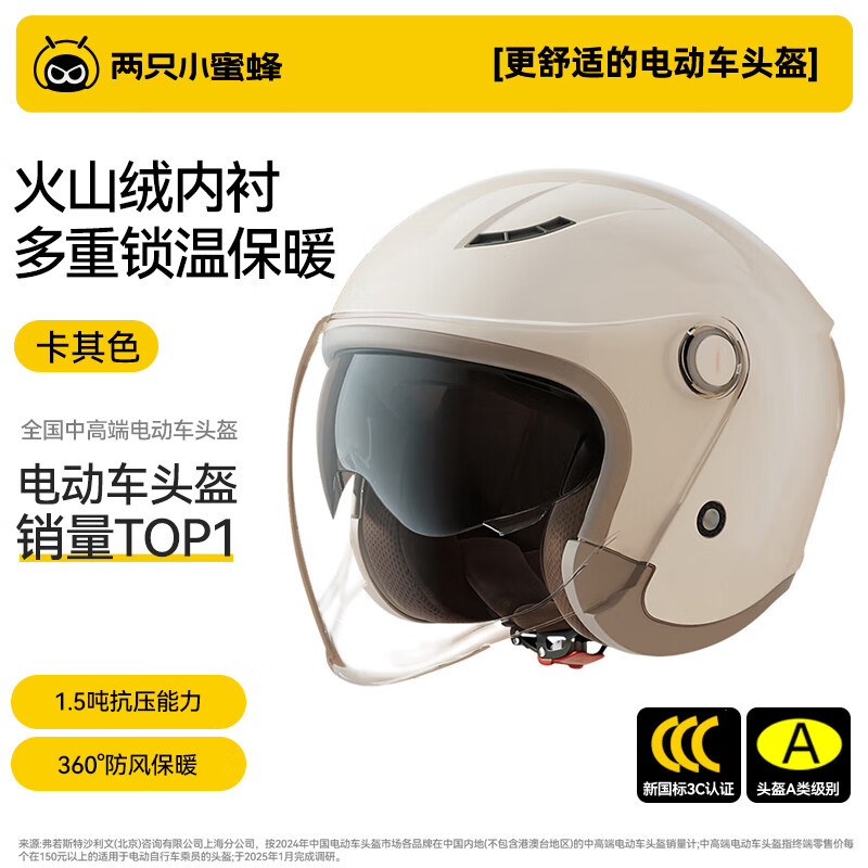 两只小蜜蜂新国标3C认证头盔 电动车摩托车头盔高清防雾双镜3/4盔A类 男女四季通用头盔冬季保暖TK312卡其色