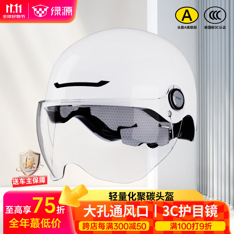 绿源(Luyuan)电动车头盔A类男女通用自行电瓶车骑行夏季半盔摩托机车安全帽 珍珠白【双层+PC短镜】3C新国标 均码