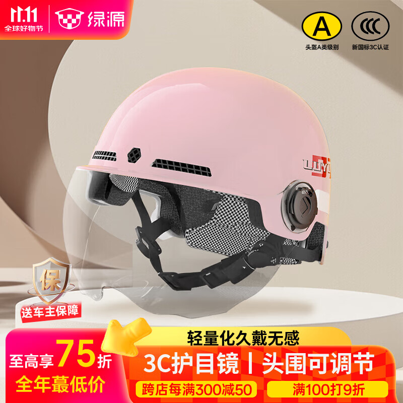 绿源(Luyuan)电动车头盔A类男女通用自行电瓶车骑行夏季半盔摩托机车安全帽 桃粉色【双层+PC短镜】3C新国标 均码