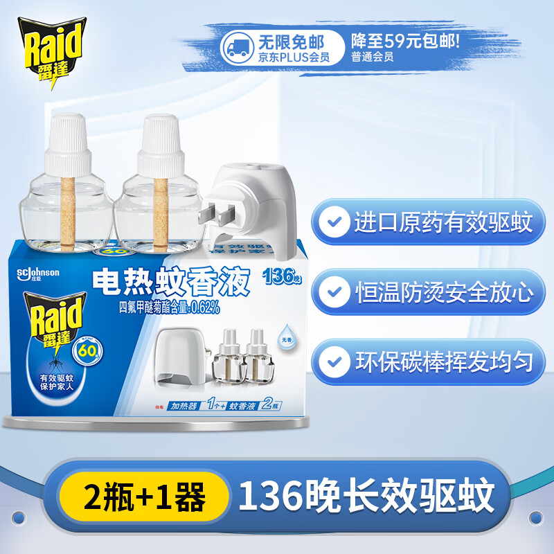 雷达(Raid)(Raid) 电蚊香液 136晚2瓶装+无线加热器 无香型 防蚊液