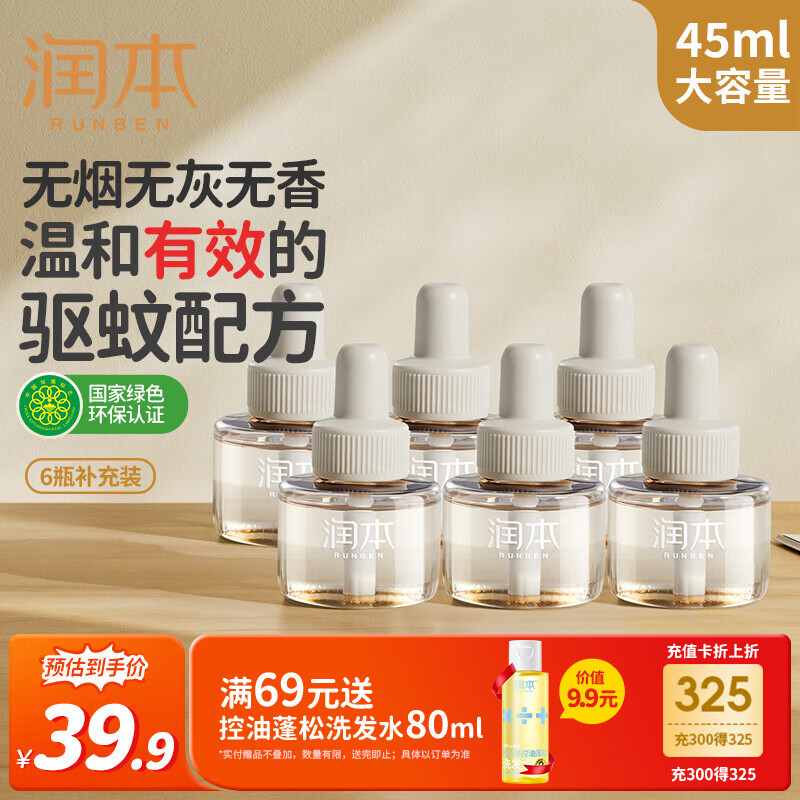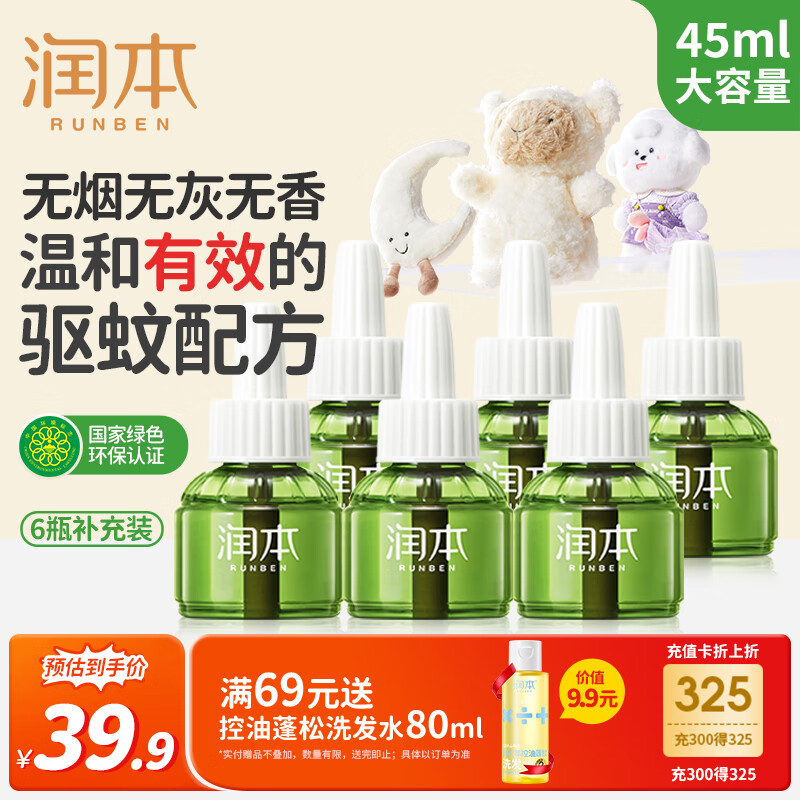 润本(RUNBEN)电蚊香液180晚45ml×6瓶补充装防蚊驱蚊水无香型