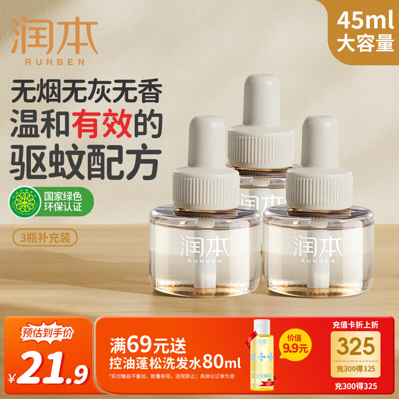 润本(RUNBEN)蚊香液电蚊香驱蚊液90晚45ml×3瓶补充装防蚊无香型