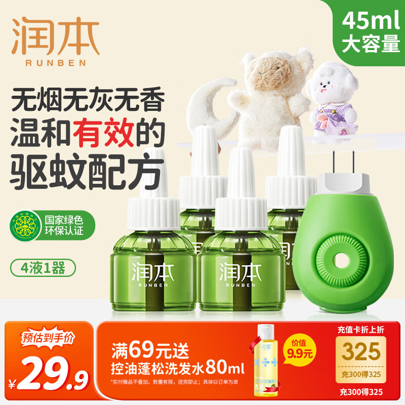 润本(RUNBEN)电蚊香液驱蚊液蚊香液120晚45ml×4瓶+1个加热器驱蚊