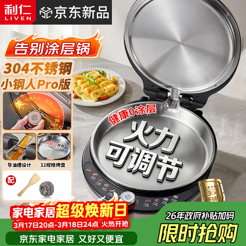 利仁(Liven)新品小钢人Pro不锈钢电饼铛家用0涂层38MM深盘可调火2000W双面加热电饼档烙饼锅早餐机LR-XGR3297