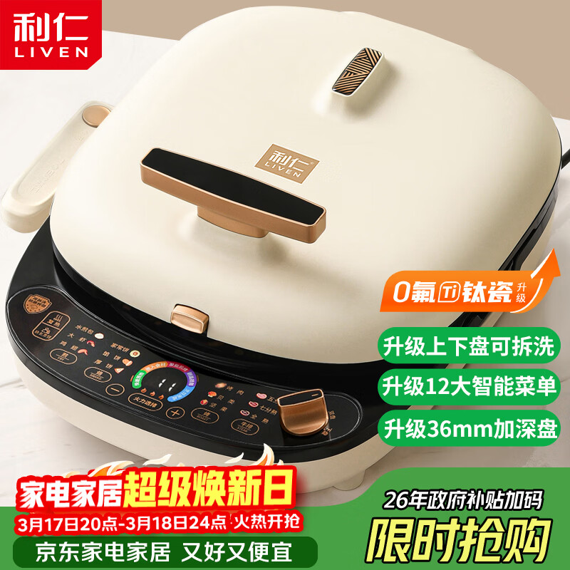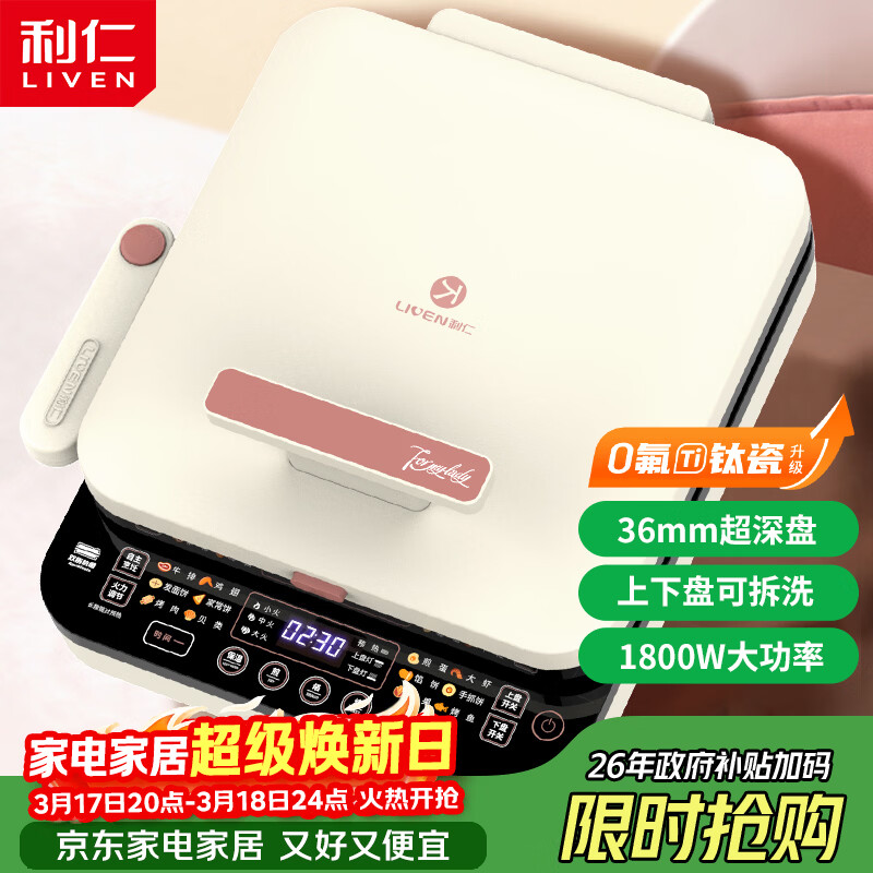 利仁(Liven)【优惠限今天】0氟钛瓷超耐磨电饼铛上下盘可拆36mm加深家庭用1800W双面加热电饼档早餐机煎饼锅
