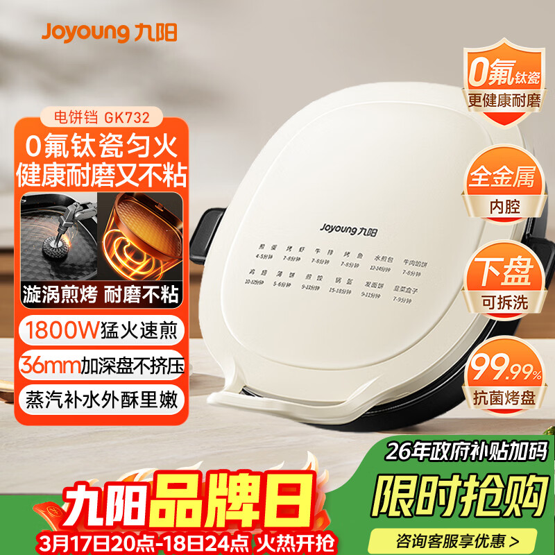 九阳(Joyoung)电饼铛三明治机早餐机 36mm加深烤盘 0氟钛瓷超耐磨少油 下盘可拆 漩涡加热大火力烙饼锅GK732