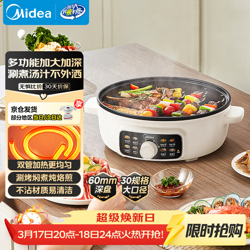 美的(Midea)电饼铛家用 电饼档 双面加热煎饼烙饼锅 煎烤机早餐机三明治 30CM大尺寸加大加深电煎烤肉锅JHN30F