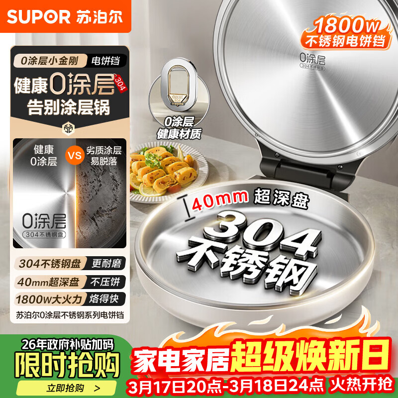 苏泊尔(SUPOR)电饼铛 0涂层304不锈钢 电饼档家用 煎饼锅烤肉锅 烙饼锅早餐机煎烤机 40mm加深 JJ30A830