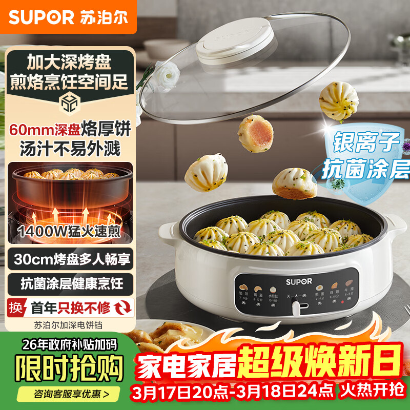 苏泊尔(SUPOR)1400W大功率 多功能锅电饼铛家用 单面煎饼锅加大烙饼锅不粘锅早餐机煎烤机电火锅 60mmJT30A818