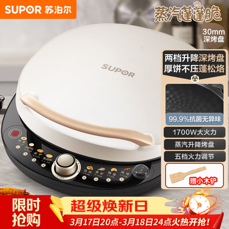 苏泊尔(SUPOR)电饼铛双面加热独立控温电饼档家用煎饼铛 升级加深加大烤盘早餐机 多功能不沾电饼锅春饼机烙饼锅 五档火力调节 抗菌大烤盘可升降