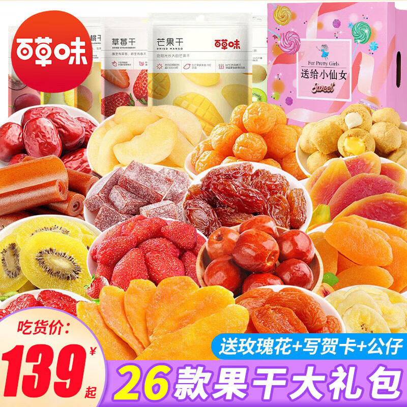 百草味水果干零食大礼包送女友礼物巨型蜜饯休闲食品草莓山楂小吃整箱盒 26款精选果干零食大礼包【送给小仙女礼盒】