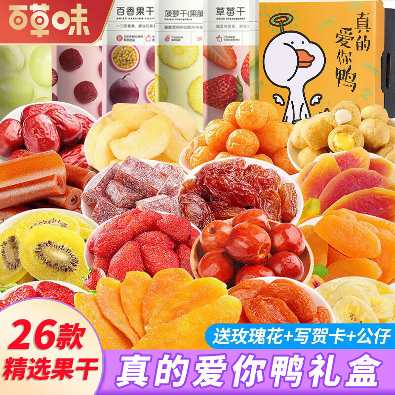 百草味水果干零食大礼包送女友礼物巨型蜜饯休闲食品草莓山楂小吃整箱盒 26款精选果干零食大礼包【真的爱你鸭礼盒】