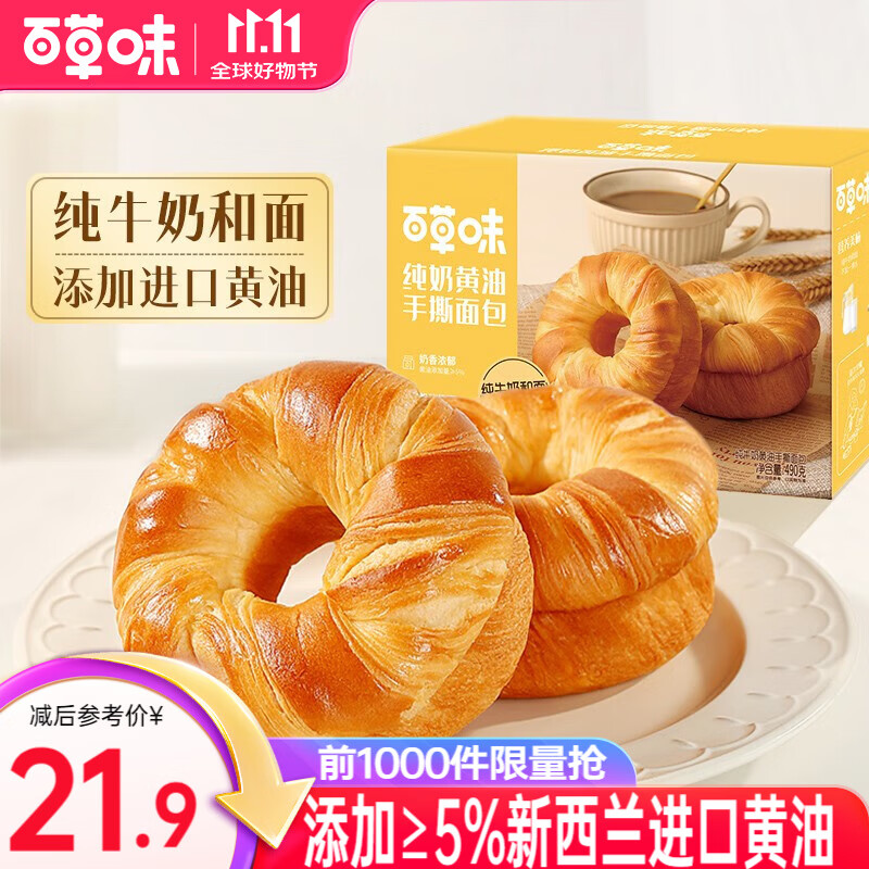百草味 手撕面包 早餐面包零食整箱量贩休闲食品 原味 490g 【进口黄油】