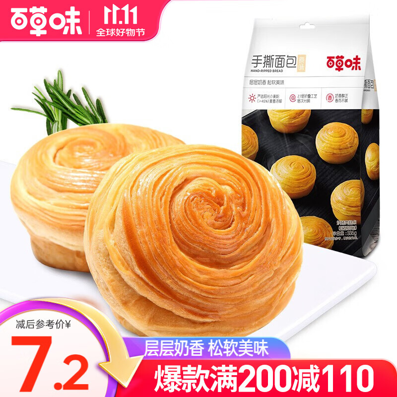 百草味手撕面包280g/袋 早餐小面包代餐蛋糕糕点点心休闲零食团购