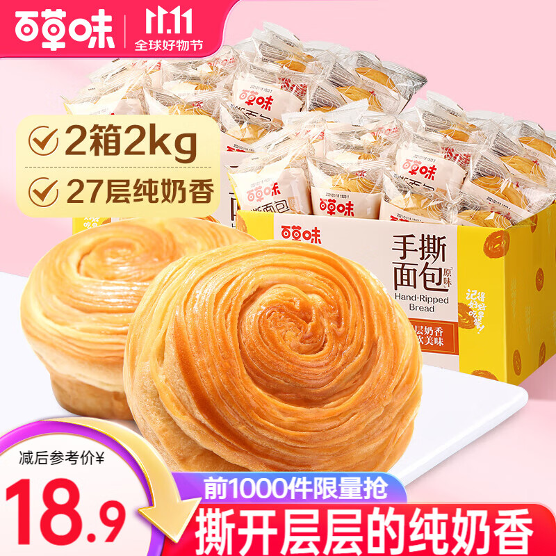 百草味手撕面包 早餐面包零食整箱量贩休闲食品 原味 1000g *2箱【经典囤货】