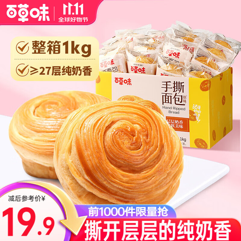 百草味手撕面包1000g 早餐小面包代餐蛋糕糕点点心整箱量贩休闲零食团购