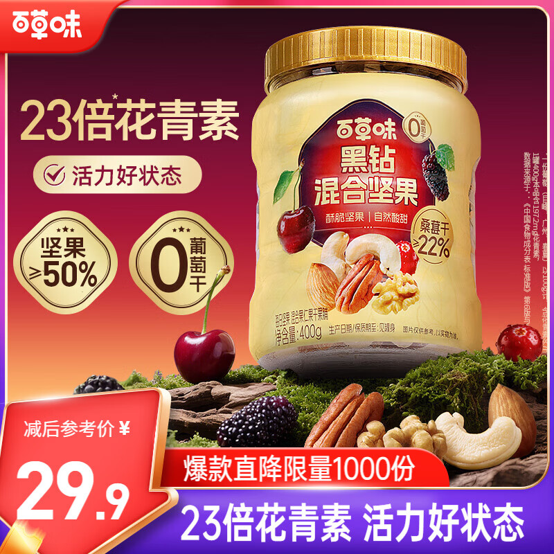 百草味黑钻混合果仁400g 每日坚果花青素桑葚4种坚果0葡萄干