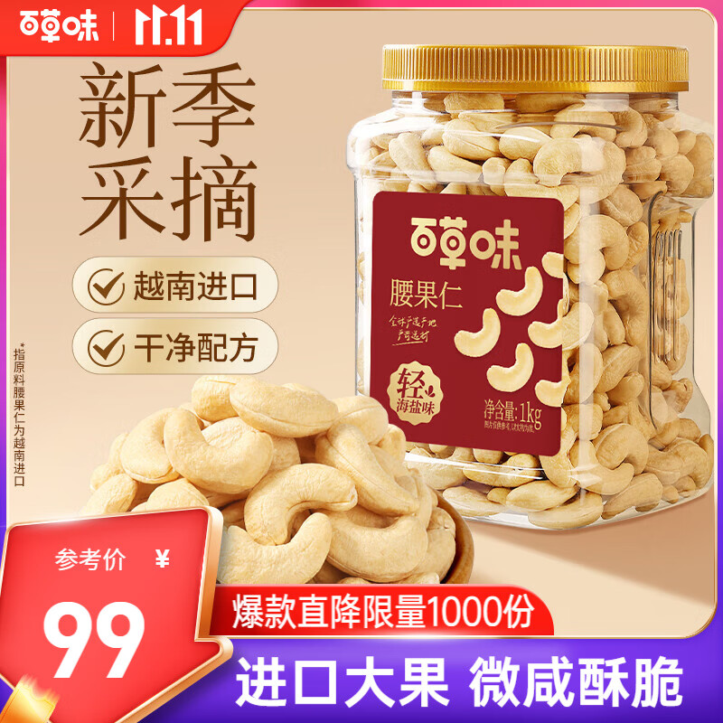 百草味轻海盐味腰果仁1kg 罐装每日坚果炒货干果休闲零食量贩送礼团购