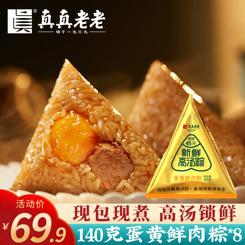 真真老老 粽子 嘉兴肉粽 老字号经典肉粽蛋黄肉粽豆沙蜜枣粽小金袋送礼 【45天短保-高汤臻鲜】蛋黄肉粽100g*8只